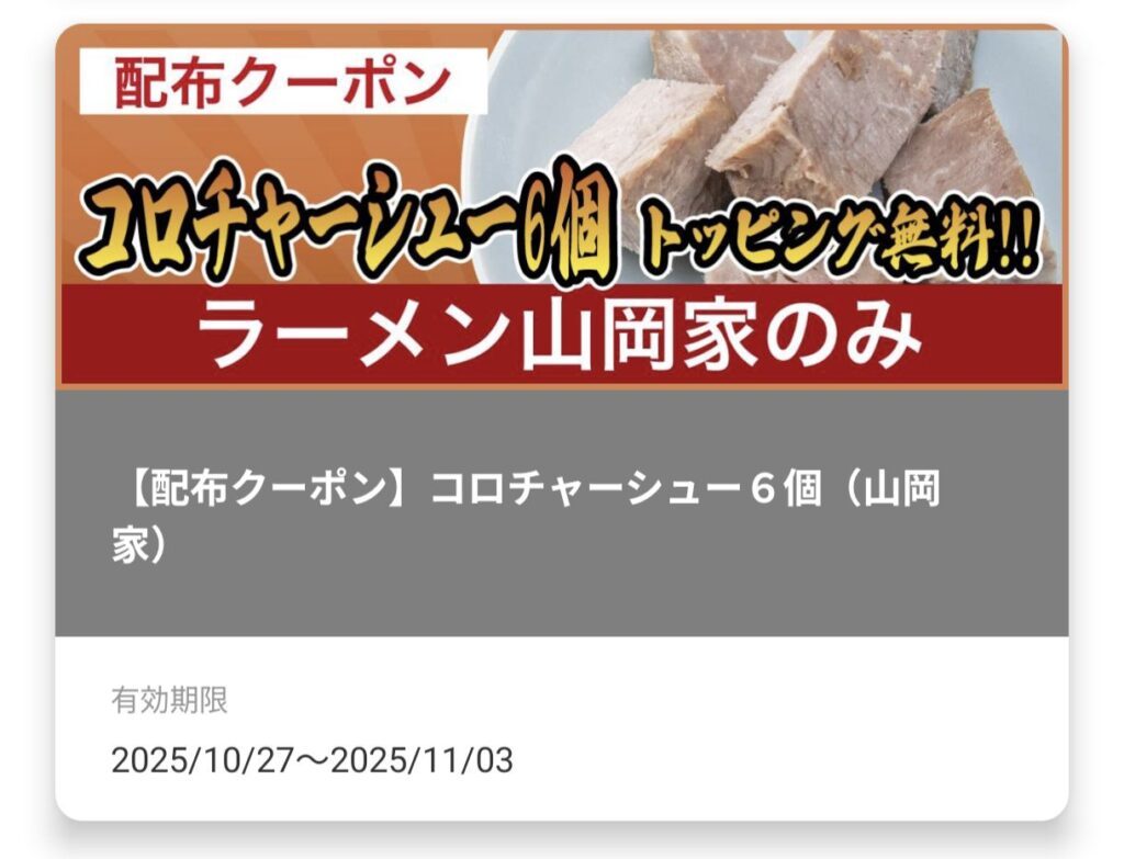 山岡家アプリを入れておくだけで、なんと2種類の無料クーポンが頂けちゃいます!