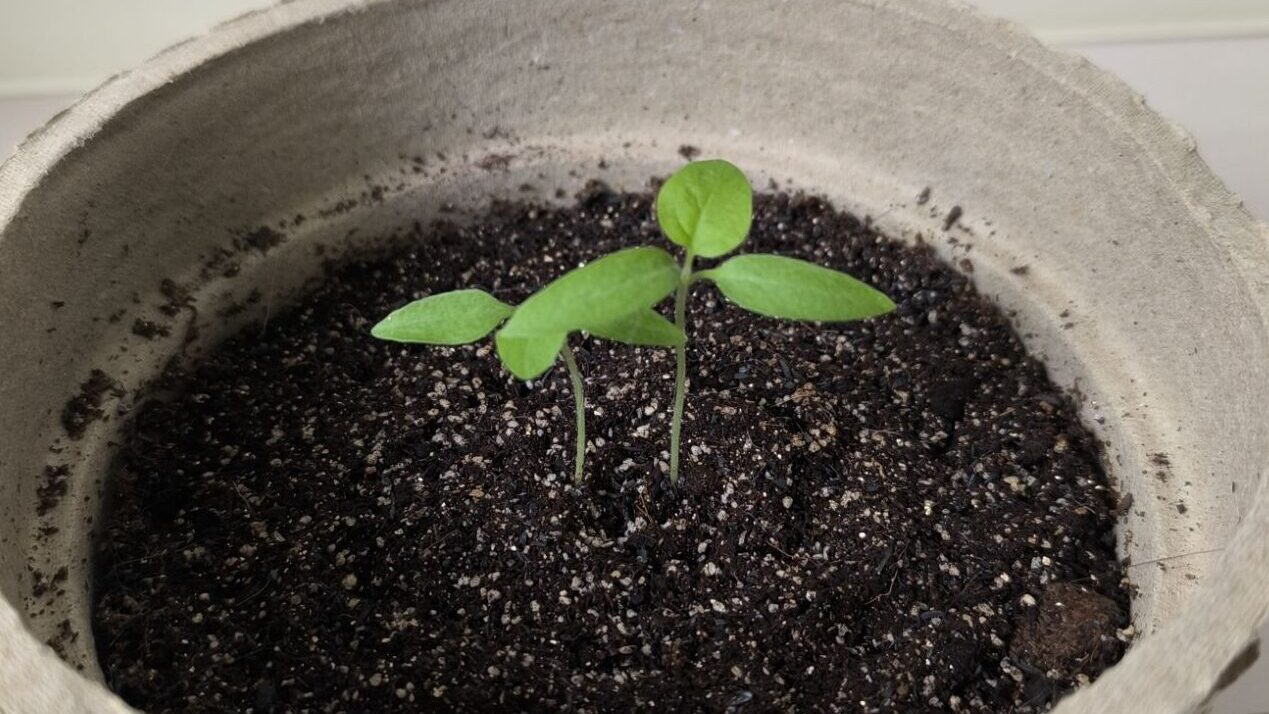 発芽直後は小さかった双葉も大きくなって、真ん中には本葉がちょこっと見えてきました。