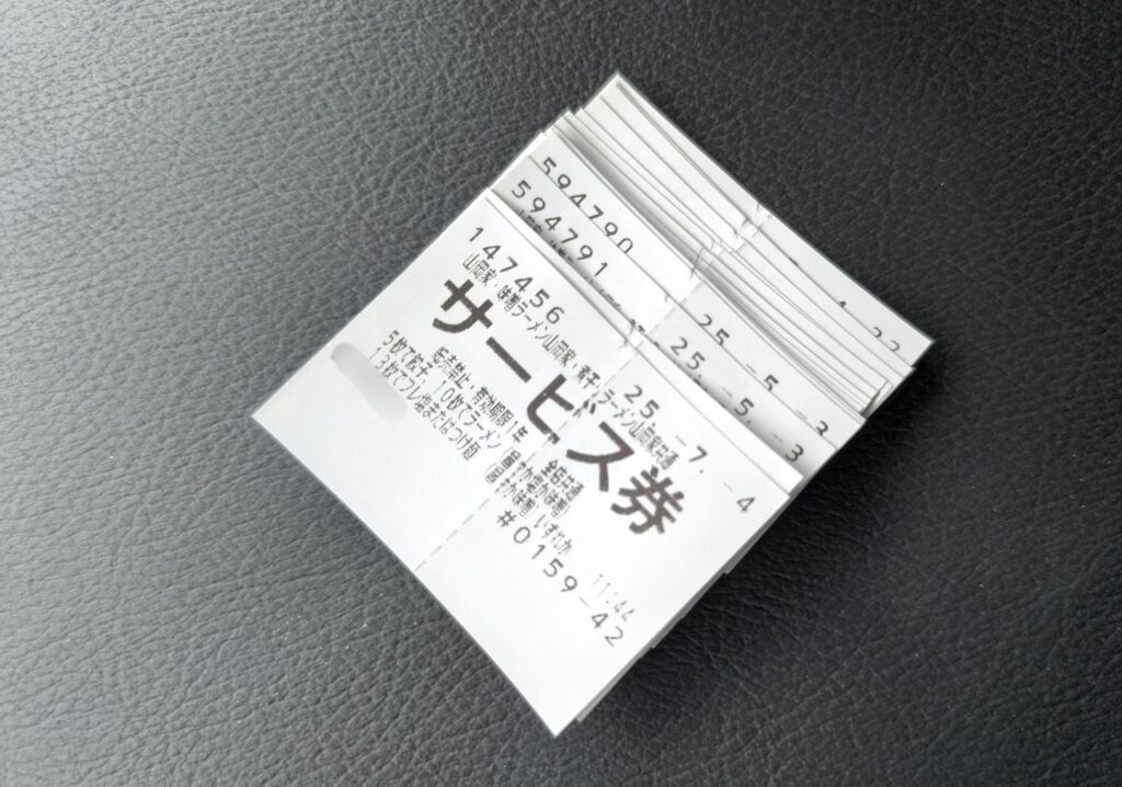 山岡家では、ラーメン(朝ラーメンを除く)を1杯注文するとサービス券が1枚発行されます。