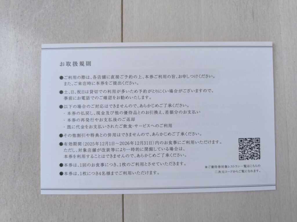 指定レストランにおいて、対象コースの割引やドリンク等のサービス券として利用できるものとなっています。
