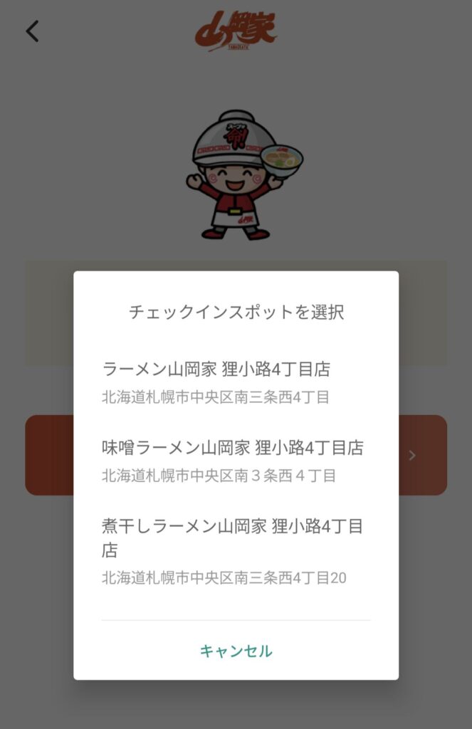 どれを押すか迷いましたが、ラーメン山岡家でチェックインしました(笑)