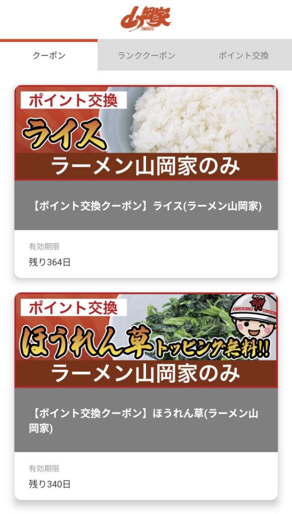 ほかにも山岡家アプリでは、ランククーポンや配布クーポンがあるのですが、今回はどちらも配布がありませんでした(泣)