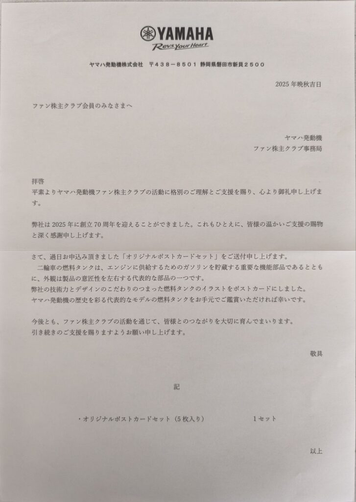 今回届いた隠れ優待は、ヤマハ発動機ファン株主クラブ会員限定のプレゼント企画なんです!