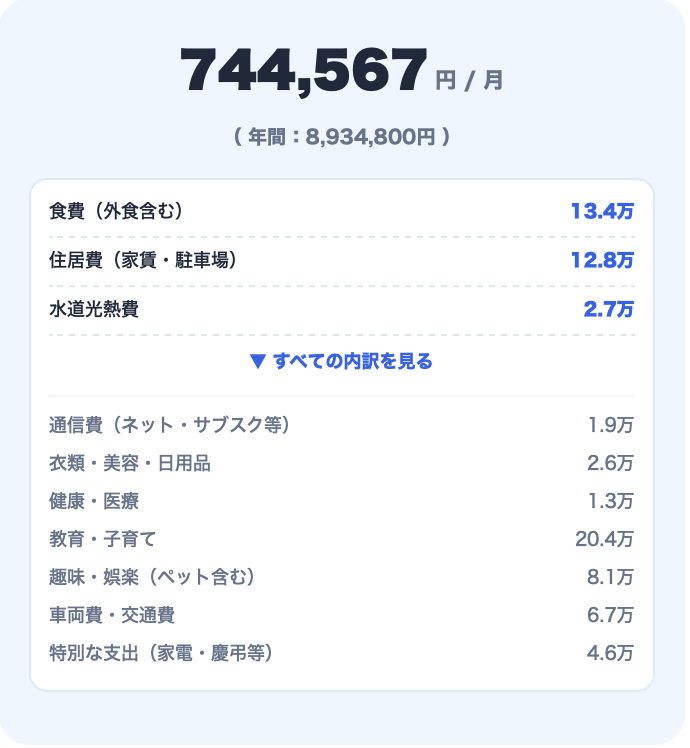 | 5人(小・中高・大学生)・持ち家・車2台・ペット(犬) | 月74.4万円 |